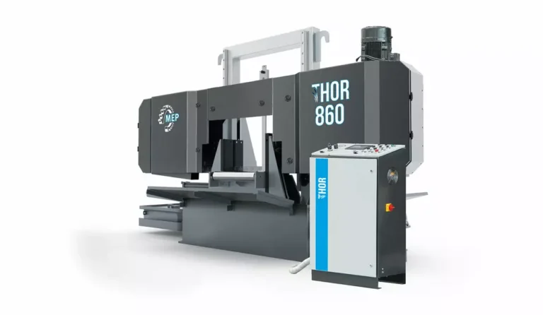 THOR 860, sierra de cinta semiautomática, de doble montante, para realizar cortes de 0° de aceros de construcción perfilados, con dimensiones comprendidas en 860x860 mm.